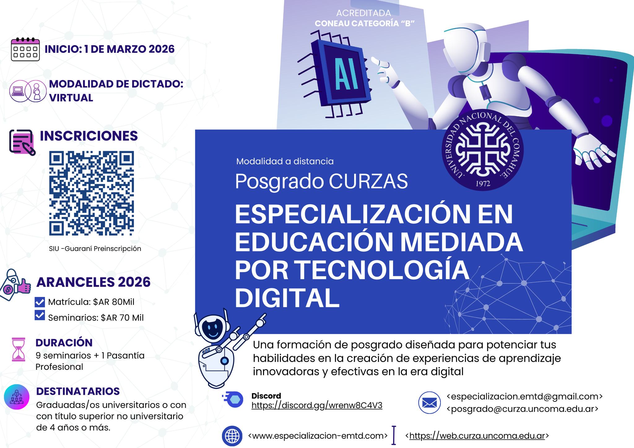 Aranceles: inscripción: $2000 (con bonificación de $1000 para profesionales matriculados en CPCE, graduados y docentes UNComa y afiliados AEAFIP) y 2 cuotas de: $5000 (Octubre y Noviembre)